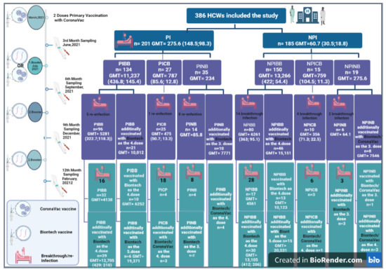 - Hueda-Zavaleta, M.; de la Torre, J.C.G.; Aguila, J.A.C.-D.; Muro-Rojo, C.; De La Cruz-Escurra, N.; Siles, D.A.; Minchón-Vizconde, D.; Copaja-Corzo, C.; Bardales-Silva, F.; Benites-Zapata, V.A.; et al. Evaluation of the Humoral Immune Response of a Heterologous Vaccination between BBIBP-CorV and BNT162b2 with a Temporal Separation of 7 Months, in Peruvian Healthcare Workers with and without a History of SARS-CoV-2 Infection. Vaccines 2022, 10, 502. [Google Scholar] [CrossRef]