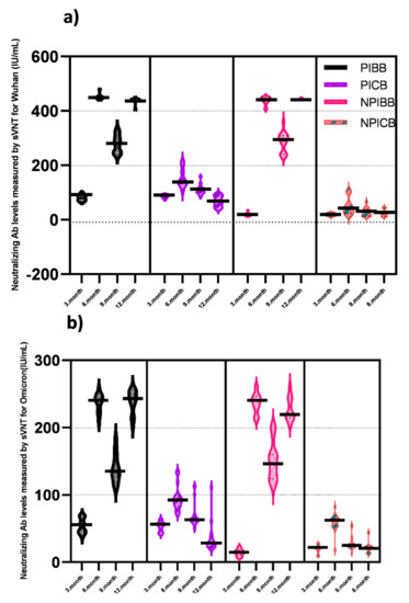 | Anti–SARS–CoV–2 neutralizing antibodies–NabWuhan, NabOmicron (95% CI) (IU/mL) | |||||||
