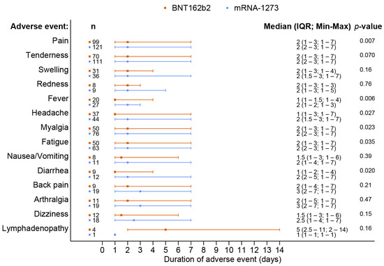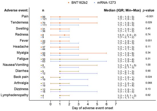 A total of 238 out of 370 patients (64.3%) reported adverse events after receiving a booster dose of the mRNA COVID-19 vaccine. The overall incidence of any adverse events associated with BNT162b2 vaccines was comparable to that of the mRNA-1273 vaccines (62.8% vs. 65.7%, p = 0.57). Although the BNT162b2 group had a higher reported incidence of grade 3 severity adverse events than the mRNA-1273 group, including all adverse events (6.5% vs. 2.3%, p = 0.41), there was no statistically significant difference and the most common reported severity in both groups was mild to moderate. The most common local reaction was pain at the injection site, while the most common systemic reaction was myalgia in both vaccine types. Tenderness at the injection site was the only reaction that had a statistically higher incidence after the mRNA-1273 than after BNT162b2 vaccination (56.1% vs. 40.7%, p = 0.003), as shown in Figure 1 and Table 2. In most solicited adverse events, the median onset was 1 day after vaccination and the median duration was 2 days (Figure 2 and Figure 3). The adverse event that was reported for the longest duration was lymphadenopathy (14 days in one patient).