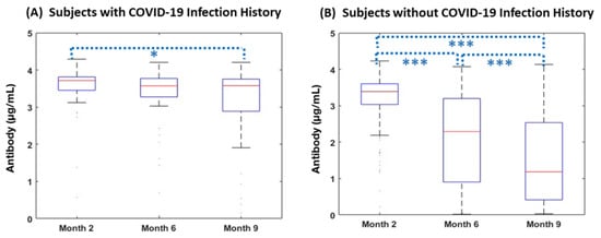 Changes in Antibody over Time per baseline COVID infection history. The following figures indicate (A) antibody responses (µg/mL) in individuals with COVID history before vaccination at Month 2 (n = 45), Month 6 (n = 44), and Month 9 (n = 34); and (B) antibody responses (µg/mL) in those without COVID history before vaccination at Month 2 (n = 224), Month6 (n = 227), and Month 9 (n = 143) after the 2nd vaccination. Levels of antibodies in both cohorts significantly decreased over time. Each box and whisker plot indicates the median, IQR, and range of antibody levels. *** p < 0.001, * p < 0.05.