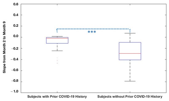 Antibody Decay Slope per baseline COVID infection history. Slopes in antibody levels from Month 2 through Month 9 were compared between subjects with COVID-19 history before vaccination (n = 46), and without COVID-19 history prior to vaccination (n = 249). The slope of antibody decline over time was significantly steeper in the subjects without a history of pre-vaccination COVID-19 infection. *** p < 0.001.