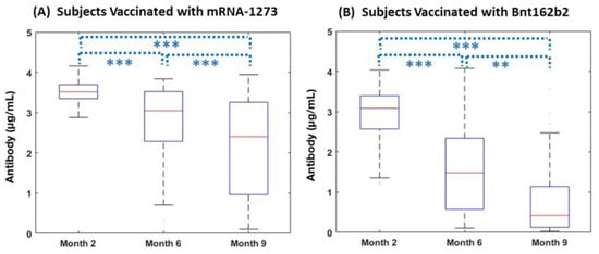 Changes in Antibody over Time by vaccine manufacturer for subjects without pre-vaccination COVID-19 infection history. (A) antibody responses (µg/mL) in individuals vaccinated with mRNA-1273 at Month 2 (n = 95), Month 6 (n = 91), and Month 9 (n = 69); and (B) antibody responses (µg/mL) in those vaccinated with bnt162b2 at Month 2 (n = 126), Month 6 (n = 133), and Month 9 (n = 71), amongst subjects without COVID infection history at baseline. Levels of antibody in both cohorts significantly decreased over time. *** p < 0.001, ** p < 0.01.