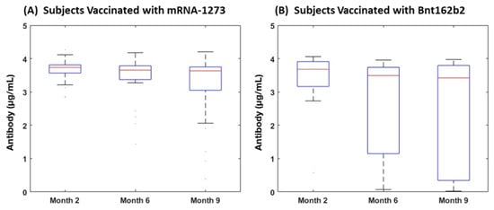 Changes in Antibody over Time per Vaccine Use for Subjects with COVID-19 Infection History. (A) Antibody responses (µg/mL) in individuals vaccinated with mRNA-1273 at Month 2 (n = 29), Month 6 (n = 29), and Month 9 (n = 25); (B) antibody responses (µg/mL) in those vaccinated with Bnt162b2 at Month2 (n = 16), Month 6 (n = 15), and Month 9 (n = 9) in subjects with a history of prior COVID-19 infection history at baseline. Levels of antibodies in both cohorts did not show statistical declines over time.