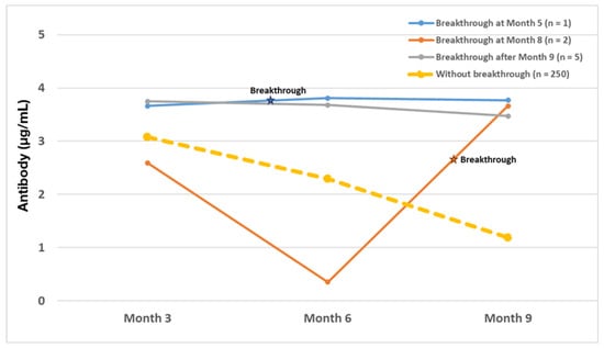 Antibody Titers in Breakthrough Subjects who had Subsequent Antibody Titer Determinations. Median antibody levels (µg/mL) for subjects without breakthrough infection after the 2nd vaccination (n = 250), subjects with breakthrough infection after Month 9 (n = 5), subjects with breakthrough infection at Month 8 (n = 2), and subjects with breakthrough infection at Month 5.