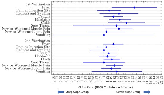 Association of Vaccine-Associated Adverse Events on Antibody Decay. Amongst all study subjects, the incidence of vaccine-associated adverse events between the gentle slope group (n = 148) and the steep slope group (n = 148) were compared. Those in the gentle slope group were significantly more likely to have fever (OR = 5.41), headache (OR = 2.41), chills (OR = 3.47), and new or worsening muscle aches (OR = 2.29) after the 1st vaccination and have new or worsening muscle aches (OR = 1.79) after the second vaccination. Blue diamonds represent the odds ratio of having reporting vaccine-associated adverse events. Bars to the left and right of each blue diamond represent the upper and lower confidence intervals.