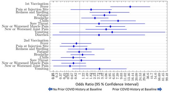 We observed that, after the 1st vaccination, subjects who reported prior COVID-19 infection at baseline (n = 46) had a higher OR [95% CI] of having fever (14.29 [CI: 5.05–40.59]; p < 0.001), redness and swelling (4.81 [CI: 1.69–13.65]; p = 0.005), fatigue (3.67 [1.9–7.07]; p = 0.001), headache (2.23 [CI: 1.09–4.54]; p = 0.03), chills (7.54 [CI: 2.99–19.06]; p < 0.001), new or worsening muscle pain (5.03 [2.31–10.94]; p = 0.001), new or worsening joint pain (4.02 [CI: 1.36–11.9]; p = 0.02), and taking antipyretic or anti-inflammatory medication (2.08 [1.06–4.06]; p = 0.04) compared to those who reported no such prior exposure. There were no significant differences in vaccine-associated adverse event profiles after the 2nd vaccination.