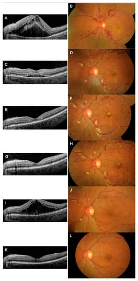SD-OCT and color fundus imaging over the 7 months since first presentation. (A,B) Initial presentation of diffuse flame shape hemorrhage, macular edema and disc edema with visual acuity of 20/100 in the left eye. (C,D) Three weeks after intravitreal injection of ranibizumab, macular edema decreased. Intravitreal injection of aflibercept was given for incomplete treatment response to ranibizumab. (E,F) Six weeks after the diagnosis, macular edema subsided. (G,H) Three months after the diagnosis, progressive retinal hemorrhage was observed. A second dose of aflibercept was given. (I,J) Six months after the initial diagnosis, recurrent macular edema was observed and the third dose of aflibercept was administered. (K,L) Seven months after the diagnosis, macular edema completely subsided with no retinal hemorrhage observed.