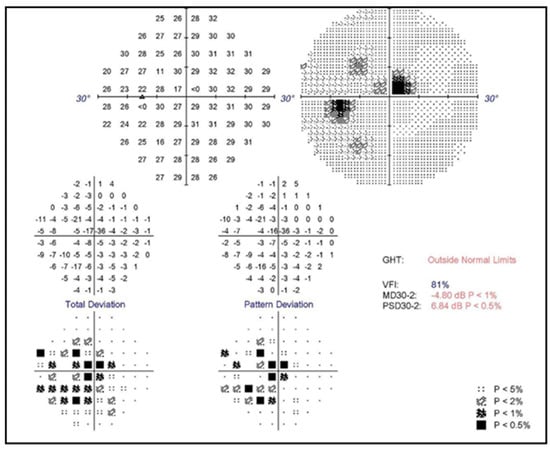 Auto-perimetry (Humphrey 30−2) of the left eye. A paracentral scotoma with mean deviation of −4.80 dB was noted on the left eye.