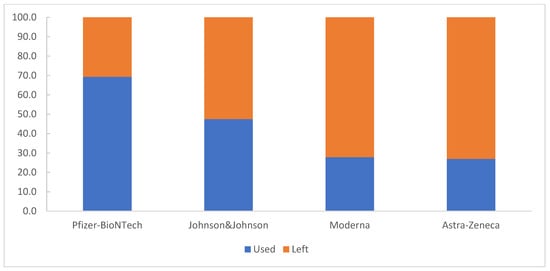 The Comirnaty/Pfizer–BioNTech vaccine represented the largest quantity of available vaccine doses (17,363,970 doses distributed; 62%); 69% of the distributed doses were used during the study period (