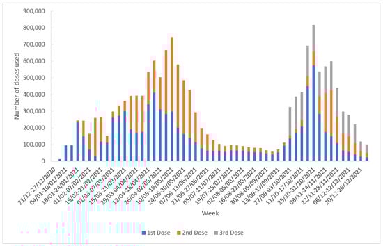 The median number of doses administered weekly was 265,140 (IQR = 333,360.75) with a maximum of 816,798 doses administered during the week of 25 October 2021–31 October 2021; most of these were the first dose in the series (575,434; 70%). The majority of the doses administered as the third dose were administered during the week of 04 October 2021–10 October 2021 (194,838; 10%) (