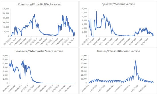 Figure 3, we can see that at the very beginning of the vaccination campaign, all of the vaccines available at that time were highly utilized. The use of the Vaxzevria/AstraZeneca vaccine fell sharply by the second half of March 2021 as a consequence of the concerns related to the safety of this vaccine. During the summer of 2021, the number of doses administered (regardless of the brand) was low because the severity of the pandemic decreased during that period and the authorities mitigated the public health measures. At the end of September 2021, the administration of the booster dose began, with mRNA vaccines being mainly recommended as a booster dose regardless of the vaccine used as the primary vaccination.