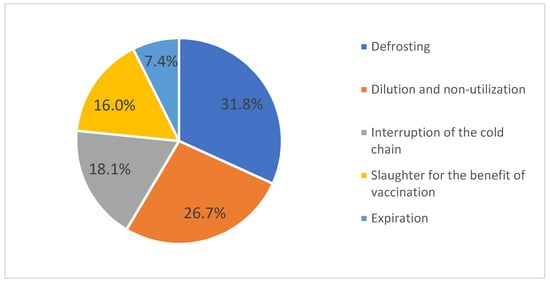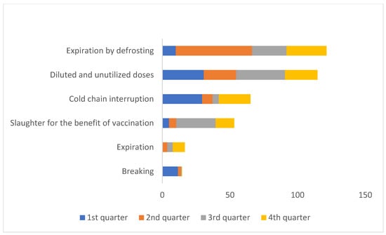 During the first quarter of the vaccination campaign, dilution and non-utilization and the interruption of the cold chain (31% and 29%, respectively) were the main causes of vaccine loss. In comparison, during the last two quarters of 2021, slaughter for the benefit of vaccination represented a significant proportion of the total losses (29% during the 3rd quarter and 14% during the 4th quarter) (