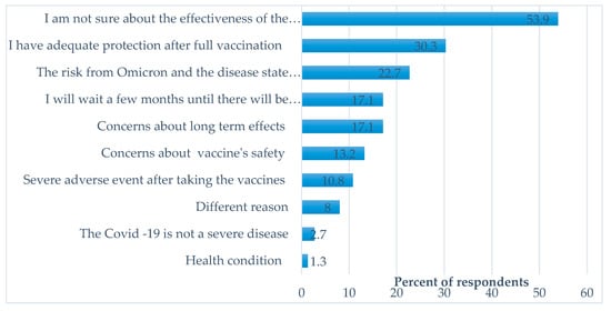 The reasons for unwillingness to get vaccinated with the booster dose are depicted in Figure 1. The most frequent reason was lack of faith in the effectiveness of the booster dose (53.9%); 30.3% of the respondents believed that they have adequate protection after two vaccine doses and therefore do not need a booster dose, and 22.7% believed that the risk from COVID-19 and the Omicron variant are not significant, and therefore the booster dose is not necessary. Waiting a few months until there will be sufficient knowledge about safety and effectiveness influenced 17.1% of HCWs. Concerns about long-term vaccination effects (17.1%) and the vaccine’s safety (13.2%) were also influential reasons.
