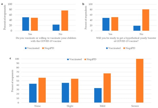 Attitudes of HCWs toward (a) vaccination of children; p = 0.04 for the difference between vaccinated and Neg4PD HCWs who responded that they would/would not vaccinate their children, (b) acceptance of a hypothetical annual booster vaccine; p = 0.002 for the difference between vaccinated and Neg4PD HCWs who responded that they would/would not get vaccinated with a hypothetical annual vaccine, and (c) reported adverse effects following prior COVID-19 vaccination; p = 0.037 for the difference between vaccinated and Neg4PD HCWs in the severity of adverse effects following prior vaccination with COVID-19 mRNA vaccine. NegP4D = having negative perception toward the fourth vaccine dose.