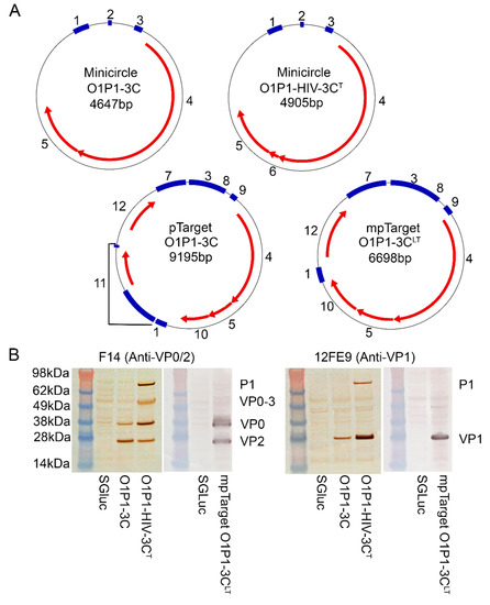 (A) All DNA vaccine constructs consisted of circular double-stranded DNA. Traditional plasmids, pTarget O1P1-3C and mpTarget O1P1-3CLT, are of larger size than minicircles O1P1-3C or O1P1-HIV-3CT. Minicircle and plasmid features; 1: SV40 polyA, 2: attP/attB, 3: CMV promoter, 4: O1P1, 5: 3C protease, 6: HIV frameshift, 7: ORI, 8: CMV enhancer, 9: Intron, 10: SGLuc biomarker, 11: Neomycin selection marker, and 12: AmpR. (B) Western blots of transfected cell lysates demonstrate fully processed VPs with O1P1-3C minicircles and mpTarget O1P1-3CLT plasmid, whereas lysates of the O1P1-HIV-3CT minicircle transfected cells demonstrate both fully processed VPs and partially processed intermediates.