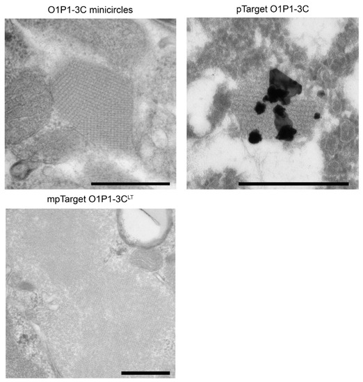 TEM of cells transfected with either O1P1-3C minicircles, pTarget O1P1-3C, or mpTarget O1P1-3CLT plasmid, showing FMDV VLP crystalline arrays; the black bar represents 500 nm. Cells transfected with pTarget O1P1-3C were evaluated by immuno-EM utilizing gold labeled F1412SA antibody.