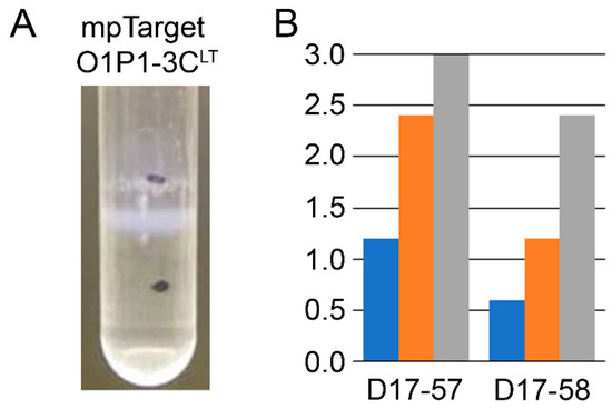 Antigen extracted from cells transfected with mpTarget O1P1-3CLT plasmid was found to (A) sediment at the appropriate density using a cesium chloride density gradient and (B) produce VNTs in two guinea pigs, ear tags D17-57 and D17-58, inoculated in a non-challenge study at 7 (blue) and 14 (orange) days post-vaccination. VNTs were further enhanced at 28 days post-vaccination (gray) following a boost at day 21.