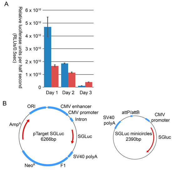 (A) Relative luciferase units per half second of IBRS2 cells transfected with either traditional plasmid, pTarget (blue), or minicircles (red), expressing the SGLuc reporter and monitored over three days of expression. (B) Minicircles are less than half the size of pTarget, they do not contain additional features to enhance transgene expression, such as chimeric intron and CMV enhancer sequences.