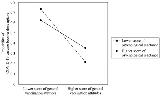 Figure 1 shows the hypothesized path for each of the hierarchical model. Results from hierarchical regression analysis are presented in Table 4. Model 1a, Model 2a, and Model 3a estimated the main effects of negative attitudes towards vaccination in general, trust towards the governmental vaccination policy, and trust towards governmental measures for controlling COVID-19 in general on uptake of a booster dose respectively. Model 1b, Model 2b, and Model 3b investigated the moderating role of psychological reactance in such relationships respectively. As results from Model 1a, Model 2a, and Model 3a show, after controlling for psychological reactance and significant background characteristics, there were significant main effects of negative attitudes towards vaccination in general (ORa = 0.24, 95% CI: 0.13–0.44), trust towards the governmental vaccination policy (ORa = 1.71, 95% CI: 1.29–2.28), and trust towards governmental measures for controlling COVID-19 in general (ORa = 1.49, 95% CI: 1.16–1.92) on uptake of a booster dose. After adding each of two-way interaction terms to Model 1b, Model 2b, and Model 3b respectively, we found that psychological reactance significantly moderated the relationship between negative attitudes towards vaccination in general and uptake of a booster dose (ORa = 0.44, 95% CI: 0.21–0.94). The result from single slope analysis is presented in Figure 2. It can be seen that the gaps in uptake of a booster dose between people with more positive attitudes towards vaccination in general and more negative attitudes towards vaccination in general reduced with an increase in psychological reactance.