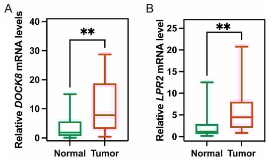 The expression of tumour antigen in clinical tumour patients. The expression of DOCK8 (A) and LRP2 (B) in tumour and normal tissues of 19 KIRC patients; (** p < 0.01).