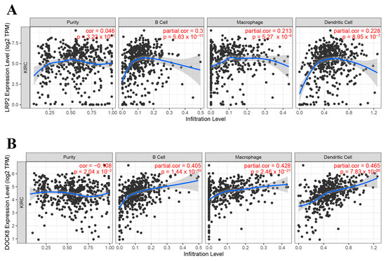 Identification of APC-associated tumour antigens. Correlation of LRP2 (A) and DOCK8 (B) expression levels in KIRC tumours with B cell, macrophage, and dendritic cell infiltration. Antigen-presenting cells (APC); Kidney renal clear cell carcinoma (KIRC).