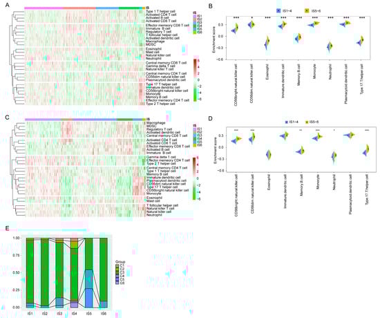 Cellular and molecular characterisation of tumour immune subtypes. In the TCGA (A) and GEO (C) cohorts, 28 immune cell signatures were differentially enriched in KIRC immune subtypes. Differential enrichment scores of 28 immune cell signatures in the TCGA (B) and GEO (D) cohort. (E) Proportion of overlap between the KIRC immune subtypes and the six pan-cancer immune subtypes. The Cancer Genome Atlas (TCGA); Gene Expression Omnibus (GEO); Kidney renal clear cell carcinoma (KIRC). (* p < 0.05, ** p < 0.01, *** p < 0.001).