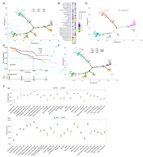 Immune landscape of KIRC. (A) Each dot represents a patient, and the immune subtypes are indicated in different colours. (B) Correlation between the principal component and immune cell infiltration. (C) Patients separated by the immune landscape based on their location. (D) Isolated patients have different prognoses. (E) Immune landscape of immune subgroups of IS2 and IS5 in KIRC. (F) Differential enrichment scores of 28 immune cell characteristics in the IS2 and IS5 subsets. Kidney renal clear cell carcinoma (KIRC); Immune subtype (IS). (* p < 0.05, ** p < 0.01, *** p < 0.001).