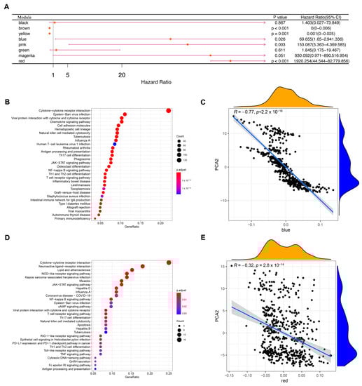 Identification of KIRC immune-related hub genes. (A) Single factor survival analysis of blue and red modules in KIRC. (B) A dot plot showing the top 30 biological processes in the blue module. (C) Correlation between feature vectors of the blue module and the second principal component in the immune landscape. (D) The red module shows the dot plot of the top 30 biological processes. (E) Correlation between red module feature vectors and the second principal component in the immune landscape. Kidney renal clear cell carcinoma (KIRC).