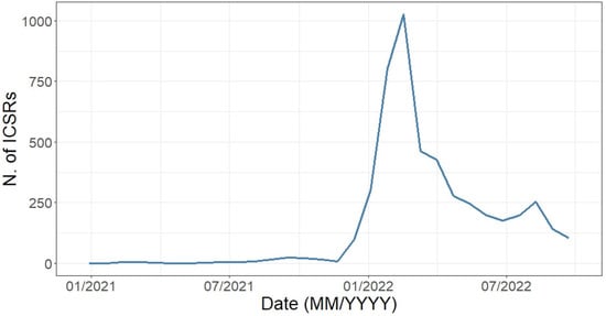 Distribution of Individual Case Safety Reports having an mRNA COVID-19 vaccine as suspect drugs by month (1 January 2021–1 October 2022).