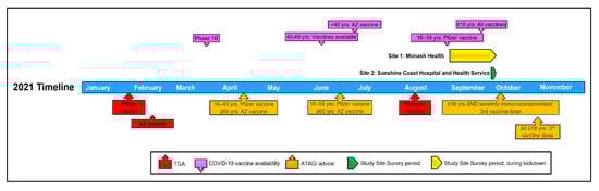 This cross-sectional study was implemented at two public health services across two states in Australia, encompassing one metropolitan and one regional/rural area. The survey was open from 2 September to 5 October 2021. There were public health restrictions and vaccine rollout recommendations in effect during the survey period (Figure 1). The study was approved by the Monash Health Human Research Ethics Committee (RES-21-0000-364L-76466) and registered with the Australian New Zealand Clinical Trials Registry (ACTRN12621001467820).