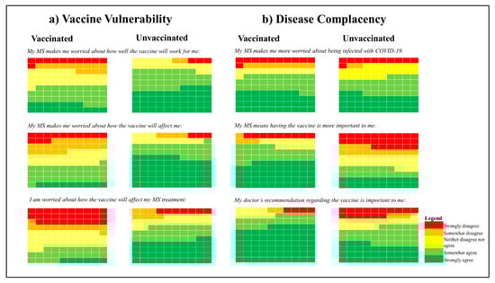 Figure 2. The frequencies of the five possible responses for each item of the DIVAS-6 subscales: (a) vaccine vulnerability (b) disease complacency. Each single-coloured box represents 1% of patient participant responses for each item, by vaccination status. ‘Don’t know’ responses were excluded. Abbreviations: DIVAS-6, Disease Influenced Vaccine Acceptance Scale-6.