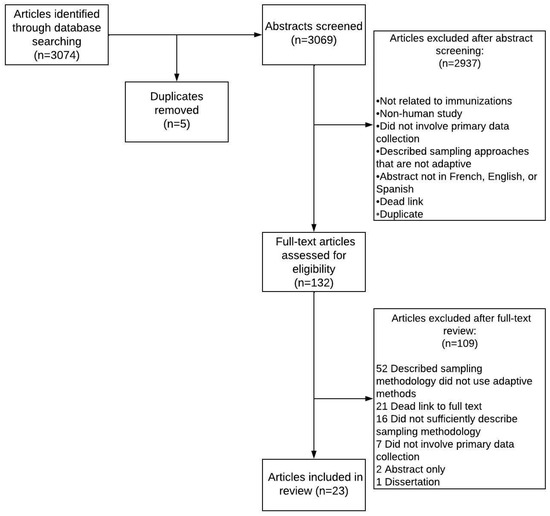 Studies were included if they met the following inclusion criteria: (i) described research on any vaccines (defined as substances used to stimulate the production of antibodies and provide immunity against one or several diseases) or immunization programs; (ii) described the use of adaptive sampling approaches to identify individuals for service delivery or participation in primary data collection; adaptive sampling was defined as substantive modifications to or expansions of conventional survey methods (with probability or non-probability sampling) to reach population sub-groups that would otherwise have a high likelihood of being missed; (iii) conducted among humans; (iv) published in English, French, or Spanish.