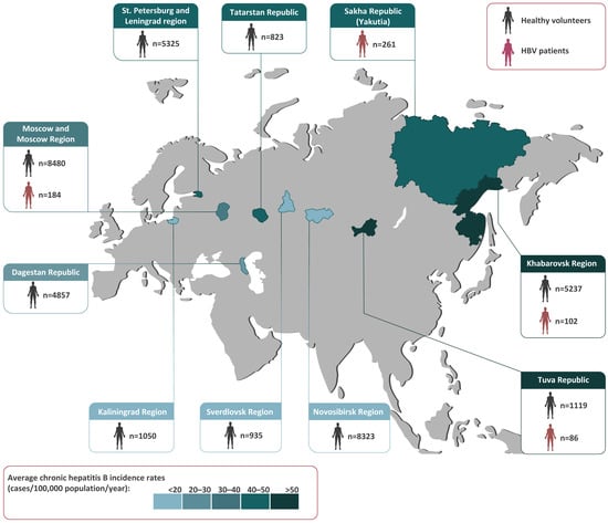 In total, 36,149 healthy volunteers from nine regions spanning the Russian Federation from west to east were recruited for the HBV serosurvey from 2019–2020. The population sample size was calculated with the chosen power (80%) and confidence level (95%) [10] for the known size of the population in the study regions and the data on HBsAg and anti-HBc antibody prevalence in Russia obtained in previous years [9]. The subjects of the study were males and females between 0 and 95 years of age, all matching the following inclusion criteria: apparently healthy with no symptoms of acute disease at the time of enrollment in the study (either self-reported or parent-reported), and permanently residing in the study regions. Exclusion criteria were liver disease, acute illnesses, a body temperature over 37.1 °C, or any surgery, blood transfusion, or treatment with blood products within the three months prior to enrollment in the study. The study was made up of eight age groups, from children aged 1–14 years to senior citizens aged over 60 years (0–9, 10–14, 15–19, 20–29, 30–39, 40–49, 50–59, and ≥ 60 years). The mean population sample size in each age group was 295 individuals (51–3106). The mean male/female ratio was 1:1.3 and varied between 1:0.8 and 1:1.5 depending on the age group.