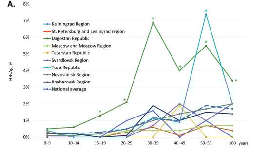 In children and adolescents under 20 years of age, i.e., in the generation born after the start of the mass vaccination program, regional HBsAg detection rates did not significantly exceed the national average, which was below 0.3% (Figure 2A). In four territories, Kaliningrad Region, Moscow Region, the Republic of Tatarstan, and Sverdlovsk Region, zero HBsAg detection rates were observed in the generation covered by vaccination at birth. In other study regions, HBsAg detection rates in subjects under 20 years of age were 0.1% in the Novosibirsk Region (4 out of 3270) and in the Khabarovsk Region (3 out of 2371), 0.2% in the St. Petersburg and Leningrad Region (1 out of 595) and in the Tuva Republic (1 out of 494), and 0.7% in the Republic of Dagestan (17 out of 2438). However, HBsAg detection rates were significantly higher in the 15–19 years age group in the Republic of Dagestan (1.3%, 7 out of 545) compared to all other regions (two-tailed p < 0.05, Chi-square with Yates’ correction). In adults, the national average of age-specific HBsAg detection rates were below 2%, but these were significantly exceeded in two regions. In the Republic of Dagestan, the HBsAg detection rate was significantly higher than the national average in all adult age groups, peaking at 6.9% in the 30–39 years age group. In the Tuva Republic, the peak HBsAg detection rate was observed in the 50–59 years age group (7.4%), although in other age groups in this region, HBsAg detection rates did not significantly exceed the national average.