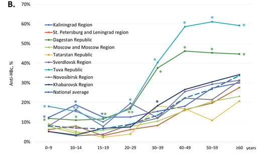 National average age-specific anti-HBc antibody detection rates were 7.4% (845 out of 11,387) in participants under 20 years old, but they increased gradually with age, peaking at 33.7% in subjects over 60 years of age (Figure 2B). A similar pattern was observed in every study region, although in several regions, age-specific anti-HBc detection rates significantly exceeded the national average. In subjects under 20 years of age, the highest anti-HBc antibody detection rates were observed in the Kaliningrad Region (above 12%) and the Republic of Dagestan (above 11%), as well as in the Tuva Republic in children under 15 years old (above 15%) and in the Sverdlovsk Region in the 10–14 years age group (16.4%). Among adults, the highest anti-HBc antibody detection rates, exceeding 35%, were observed in the Republic of Dagestan and in the Tuva Republic in subjects over 30 years old (Figure 2B).