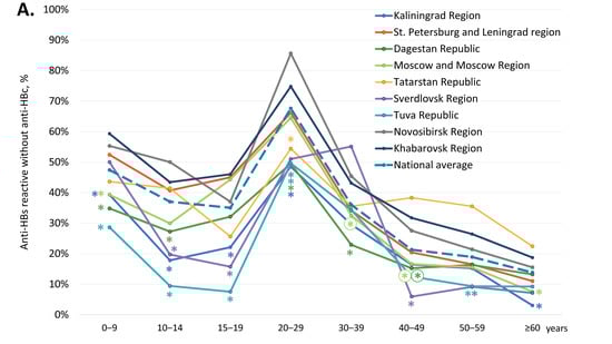 The average proportion of participants are reactive for anti-HBs antibodies but non-reactive for anti-HBc antibodies, i.e., those who have only vaccine-induced HBV immunity, was 39.4% (Table 1). In four regions, the Republic of Dagestan, the Kaliningrad Region, the Tuva Republic, and the Sverdlovsk Region, this index was significantly below the national average (two-tailed p < 0.0001, Chi-square with Yates’ correction). The overall proportion of anti-HBs-positive, anti-HBc-negative samples in subjects under 20 years old was 41.7% (4746 out of 11,387). The age-specific rates of vaccine-induced HBV immunity in the study regions are shown in Figure 3A and in greater detail in Supplementary Table S3. These rates displayed a similar pattern in all the study regions: a gradual decline from the 0–9 years age group to the 15–19 years age group, with a subsequent burst in the 20–29 years age group, followed by a gradual decline (Figure 3A), which corresponds to the response to vaccination at birth and catch-up vaccination in adolescents and young adults born after 1998. However, in a few regions, the rates of vaccine-induced HBV immunity were significantly lower compared to the national average, both in children and in adults. In subjects under 20 years old, the lowest proportion of anti-HBs-positive, anti-HBc-negative individuals was observed in the Tuva Republic, with a figure below 10%. Vaccine-induced HBV immunity rates in subjects aged 10–19 years were also below 25% in the Sverdlovsk Region and in the Kaliningrad Region (Figure 3A). In young adults (20–29 years old), the lowest rates of vaccine-induced HBV immunity, although still reaching 50%, were also observed in the Kaliningrad Region, the Republic of Dagestan, the Sverdlovsk Region, and the Tuva Republic.