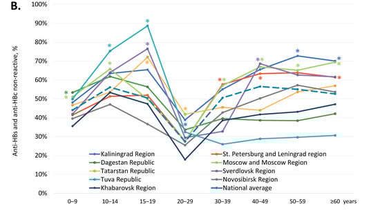 Therefore, the second objective of our study was to evaluate the level of vaccine-induced immunity in the general population and to determine the proportion of subjects who have no routinely measurable vaccine- or infection-induced immunity to HBV. The average anti-HBs detection frequency observed in the generation vaccinated at birth and the age-dependent rate of its decline were comparable to data reported from different parts of the world [42,43]. However, in several study regions (Kaliningrad Region, the Republic of Dagestan, Sverdlovsk Region, and the Tuva Republic), vaccine-induced anti-HBs rates in the vaccinated generation were significantly lower compared to the national average, being the lowest (below 10%) for the 10–19 years age group in the Tuva Republic. Similarly, low anti-HB prevalence rates were reported in the Arctic region of Canada among the 5–9 years age group following primary vaccination [44]. Theoretically, the decreased rates of anti-HBs antibodies in vaccinated generation may be associated with the possible impairment of immune responses by high maternal anti-HBs, as it was demonstrated earlier [45]. However, further studies demonstrated that even high titers of maternal anti-HBs do not inhibit the long-term immunogenicity of Hepatitis B vaccine in infants [46]. Thus, the maternal anti-HBs status may have little impact on the effectiveness of the standard infant vaccination schedule. More likely, the possible reasons for such low levels of vaccine-induced immunity observed in several regions in our study may be low coverage of complete vaccination, or corrupted vaccine immunogenicity due to faults in the vaccine cold storage chain, or some other undetermined factors, including specific human leukocyte antigen (HLA) types possibly associated with antibody response to HBV vaccination [47]. Noteworthy, neonatal HBV vaccination, being the part of national vaccination schedule, is obligatory but voluntary, providing parents the opportunity to refuse to vaccinate their children. Data of the analysis of newborn medical records from two regions of Russia indicated that parental refusal was the most frequent reason of infant HBV non-vaccinated status [5]. However, as no participant medical records were analyzed in current study, and the HBV vaccination status was assumed based on the age of the individual, the true coverage of complete HBV vaccination in study regions and individual participant vaccination status remain unknown. This constitutes a limitation of this study.