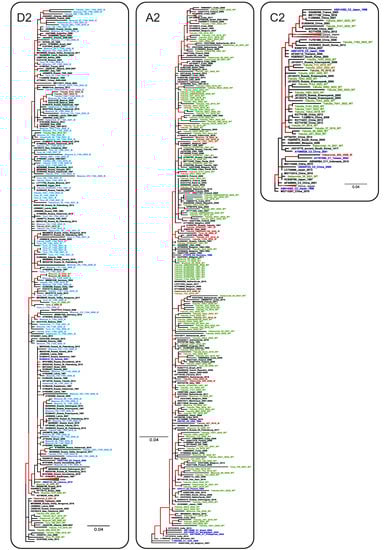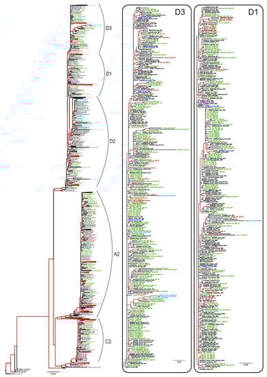 ML phylogenetic tree based on the 640 nt fragment of the HBV S-gene (nucleotide positions 157–796 by reference sequence NC_003977.2). Tree branches with a posterior probability of >90% are shown in red. Clusters containing sequences from this study and representing sub-genotypes D1, D2, D3, A2, and C2 are shown in separate panels. The GenBank database number, the HBV genotype, the country, and the year of isolation are indicated for each sequence. Sequences from this study are shown using the following colors and abbreviations: green (WT)—wild-type, red (IE)—immune-escape HBsAg variants with the exception of T118A/V, light blue (IE)—T118A/V variants, blue—reference sequences for HBV genotypes and sub-genotypes.