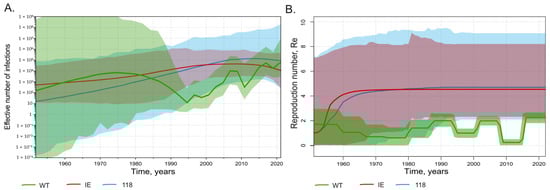 SkyGrid reconstruction (A) showing the relationship between the effective number of infections (y axis) and chronological time expressed in years (x axis), and Birth–Death Skyline reconstruction (B) showing the relationship between the reproduction number of infections (y axis) and chronological time expressed in years (x axis). The curves indicate the mean, and the 95% HPD interval is shown by the shaded area. Graphs for wild-type HBV sequences are shown in green, for immune-escape HBsAg variants except T118A/V in red, and for T118A/V variants in light blue.