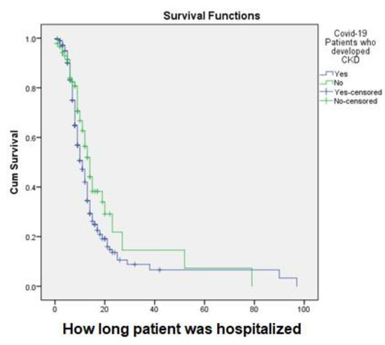 Based on the patients’ medical records, 286 patients were diagnosed with CKD following COVID-19 diagnosis. Additionally, it is reported that there is a graded association between the level of kidney dysfunction and the risk of mortality from COVID-19 [9]. Other studies indicate that COVID-19 infection can further decrease the GFR in patients with CKD (mean = 3.57 min/mL) [37]. Lin et al. reported that acute kidney injury was a common and serious complication of COVID-19 [38]. Since coronavirus is reported to enter the cells by binding to the ACE2 receptor, the high level of ACE2 receptors found in the kidneys [39,40,41] indicates that the kidney cells may be the point of entry for SARS-CoV-2 to affect the renal function.