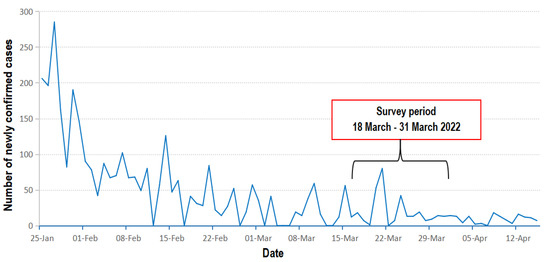 This was a cross-sectional survey among slum and estate communities conducted in Kampala and Wakiso districts in Uganda from 18 March to 31 March 2022. Kampala, the capital city, comprises five divisions (Kampala Central, Nakawa, Kawempe, Lubaga and Makindye division) and accommodates more than 3.4 million residents, of which about 50% live in informal settlements/slums [21]. The city houses the largest urban slums in the country, has a population growth rate of 3.2%, and accommodates 45% of all urban residents in Uganda [35]. Wakiso District is located in the Central Region of Uganda, and partly encircles Kampala. Wakiso is the second-wealthiest district in Uganda and houses most of the urban middle-class residents of the country [36]. During the survey period, two peaks of daily COVID-19 cases were reported on 21 March (80 cases) and 24 March (42 cases), after which daily cases remained stable and below 20 cases, as shown in Figure 1.
