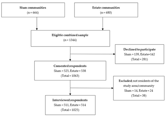 For both communities, data were collected via face-to-face interviews in English and/or Luganda. The interview took about 30 min to complete. A total of 1344 households with eligible respondents were reached, of which 319 declined to participate due to various reasons, yielding a response rate of 76.3% (76.9% for the slum communities and 75.6% for the estate communities) (Figure 2). Ethics approval was obtained from the Clarke International University Institutional Review Board (CLARKE-2021–272) and the Survey and Behavioral Research Ethics Committee of the Chinese University of Hong Kong (SBRE-21-0148).