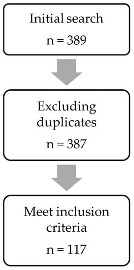 The search returned with 389 articles published through 8 September 2022. Screening of the papers led to the exclusion of 272 papers which did not comply with at least one of the inclusion criteria set (Figure 2). A total of 117 papers were included in this review. The first author reviewed, screened and characterised all articles. The two other authors reviewed the categorisation and reviewed articles that required re-examination. The authors examined articles independently. No automation tools were used in the process. Frequencies of multiple variables within the literature selected were analysed using the ggplot2 package from RStudio.