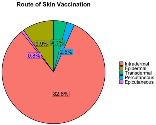 We next determined the range and frequencies of the pathogens targeted by vaccines using the skin route of administration. The pathogens were first defined as viruses, bacteria, and parasites and a fourth category, labelled “other”, which includes studies using vaccines consisting of model antigens (namely ovalbumin, OVA and keyhole limpet haemocyanin, KLH). Almost 80% of skin-delivered vaccines target viruses (Figure 3). The remainder focused on bacteria (16.5%), parasites (2.5%) and other targets (5%).