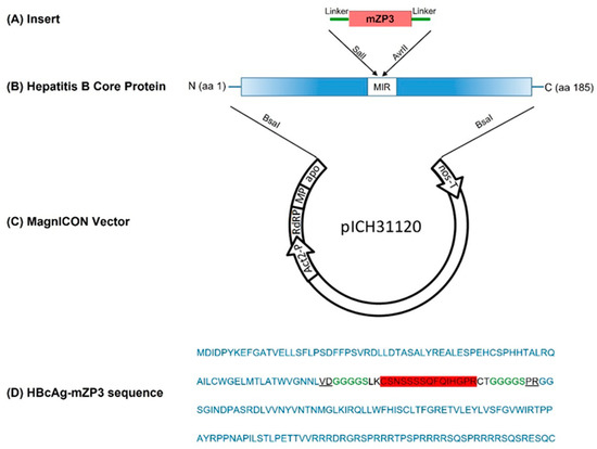 Schematic illustration of the recombinant vector, pICH-HBcAg-mZP3. Coding region for the mZP3-contraceptive epitope (A) inserted via flexible linkers (GGGGS) into the major immunodominant region (MIR) of full-length HBcAg (B). The MagnICON plant transient expression system was used in this study (C). Act2, Arabidopsis actin 2 promoter; RdRp, RNA-dependent RNA polymerase; MP, movement protein; apo: apple pectinase-apoplastidal targeting sequence; nos-T, nopaline synthase terminator. (D) Amino acid sequence of HBcAg-mZP3 construct. Amino acids of mZP3 peptide are shaded in red, flexible linkers are shown in green, and SalI and AvrII sites are underlined.
