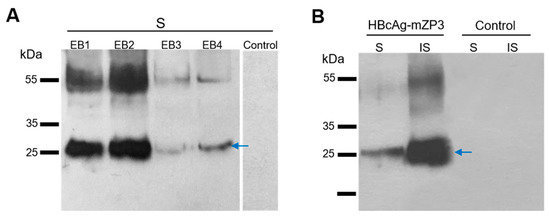 Western blot analysis of the HBcAg-mZP3 protein expressed in N. benthamiana leaves, identified in soluble (S) and insoluble (IS) fractions. (A) Effect of extraction buffer on soluble HBcAg-mZP3 extraction. Membrane probed with anti-mZP3 antibodies. (B) Detection and comparison of HBcAg-mZP3 protein in S and IS fractions extracted in EB2 condition. Extract from pICH31120-infiltrated leaves was used as control. Arrows indicate the monomeric form of HBcAg-mZP3. Blots cropped for clarity, for uncropped blots see Figure S2.