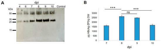 Western blot and ELISA analyses of HBcAg-mZP3 expression in agroinfiltrated N. benthamiana leaves from 4 dpi to 10 dpi. TSP was extracted from leaves on 4 dpi to 10 dpi. (A) Western blot analysis of protein extracts (20 µg TSP) probed with rabbit anti-mZP3 antibodies. Protein extracted from pICH31120-infiltrated leaves was used as control. dpi: days post infiltration. (B) Expression and accumulation of HBcAg-mZP3 were analyzed with ELISA of TSP extracted on 7–10 dpi. Error bars indicate standard deviation. *** indicates p values < 0.001. ns = non-significant difference (p < 0.5). See Figure S3 for uncropped blot. A Coomassie-stained gel of the leaf extract at 8 dpi is presented in Supplementary Material Figure S4.
