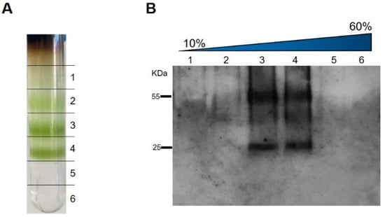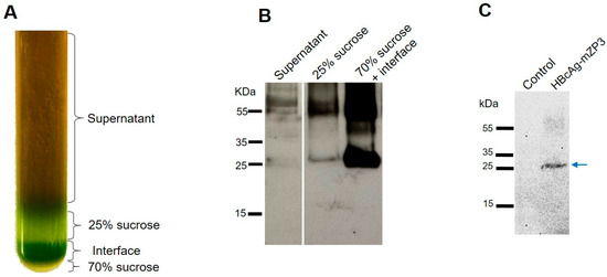 Leaves infiltrated with HBcAg-mZP3 were harvested at 8 dpi to purify the HBcAg-mZP3. Sucrose density gradients were applied to determine whether the expression of HBcAg-mZP3 in the plant led to the formation of VLPs. In the first purification method, extracts from HBcAg-mZP3-infiltrated leaves were sedimented on 10–60% sucrose gradients (Figure 4A), fractionated, and monitored by Western blotting. Analysis of the fractions from the sucrose gradient revealed a protein band corresponding to the size of HBcAg-mZP3. As shown in Figure 4B, the majority of HBcAg-mZP3 was distributed in 30–40% sucrose fractions, similar to what is known for assembled VLPs.
