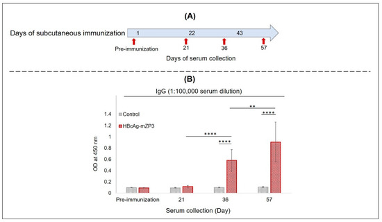 Evaluation of mean anti-mZP3 antibody responses in immunized BALB/c mice using ELISA. BALB/c mice subcutaneously immunized with plant-produced HBcAg-mZP3. (A) Immunization and sampling schedule. (B) Anti-mZP3 IgG antibody levels measured in sera before immunization and after each immunization. Data presented as mean ± SD of absorbance values at 450 nm. ** p < 0.01 and **** p < 0.0001.