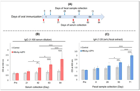 Evaluation of mean anti-mZP3 antibody responses in BALB/c mice orally immunized with plant leaves producing HBcAg-mZP3. (A) Immunization and sampling schedule. (B) Anti-mZP3 IgG antibody levels measured in sera before immunization and after each immunization. (C) Anti-mZP3 IgA antibodies in feces extract measured in samples collected before and seven days after each oral immunization. Data presented as mean ± SD of absorbance values at 450 nm. * indicates p < 0.05; ** p < 0.01, *** p < 0.001, and **** p < 0.0001.